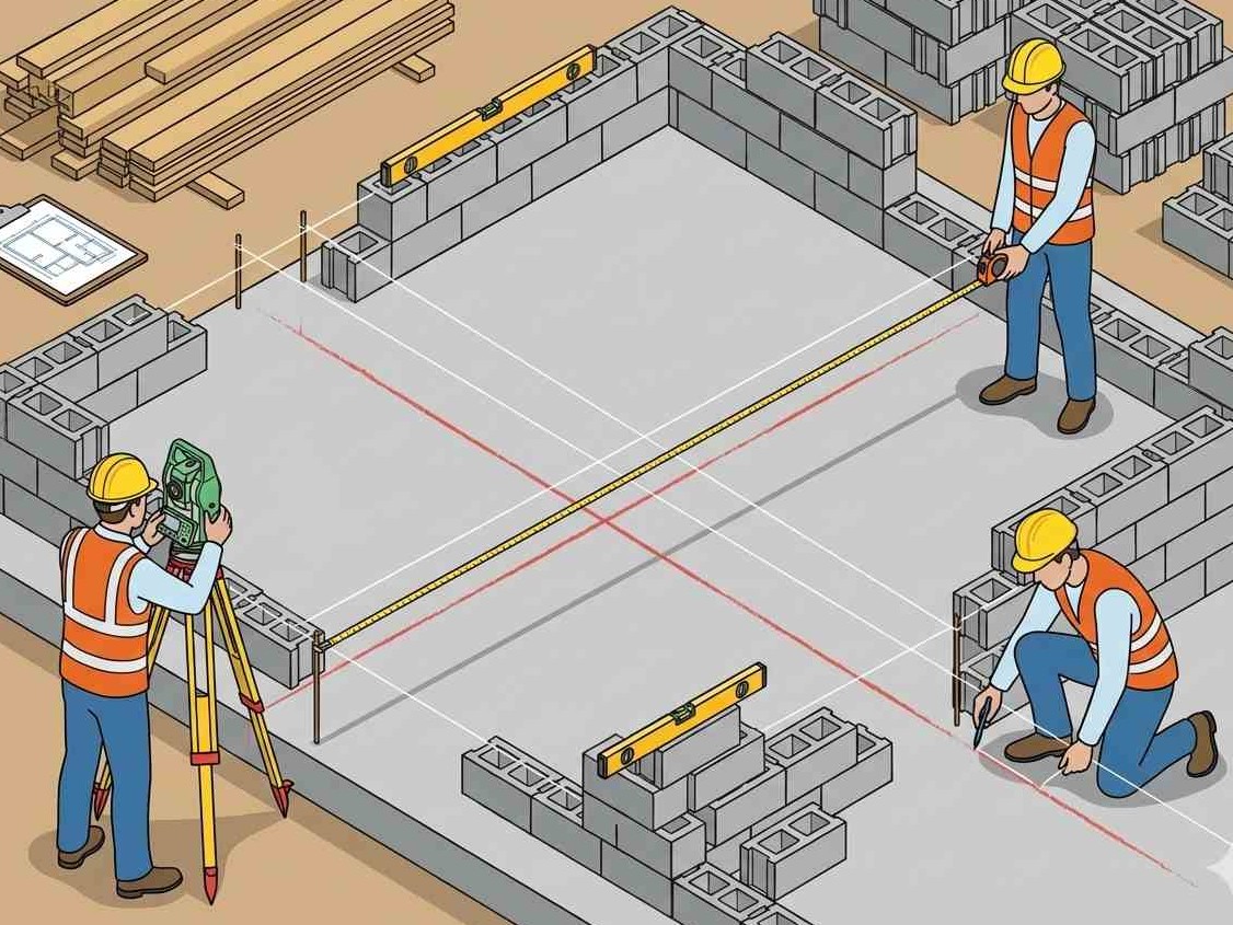 • تسلّم المحاور والمناسيب وتثبيت النقاط المرجعية (Setting Out / Benchmarks)