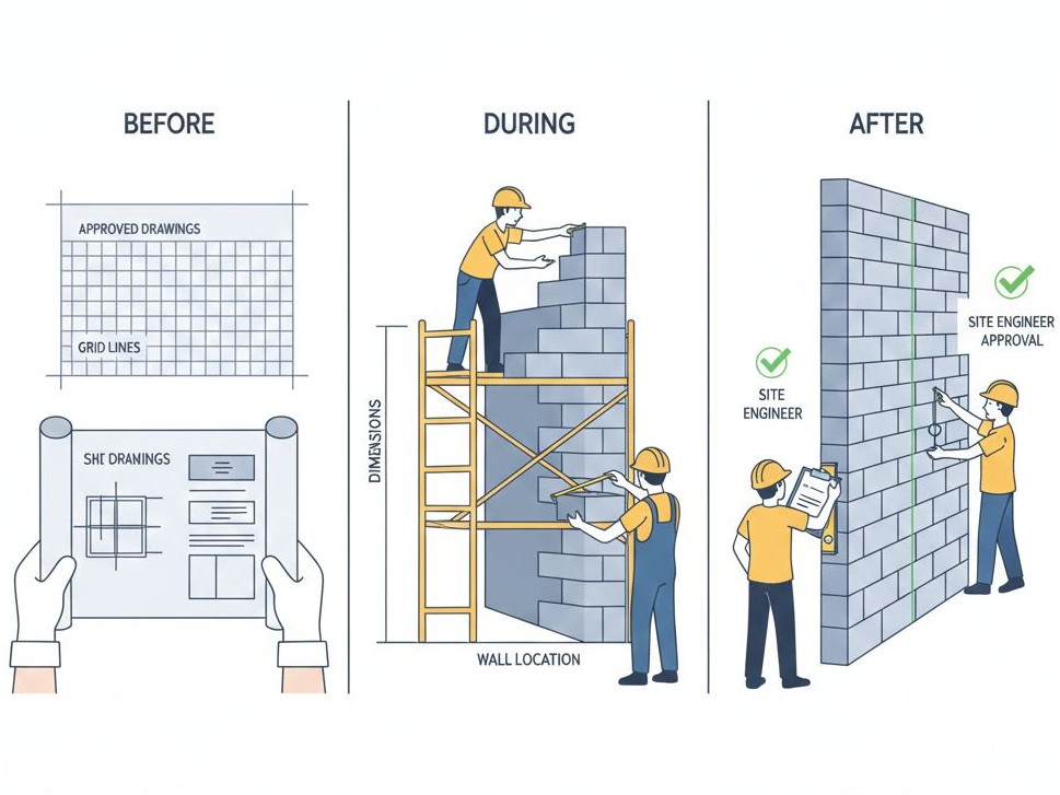 • تسلّم المحاور والمناسيب وتثبيت النقاط المرجعية (Setting Out / Benchmarks)